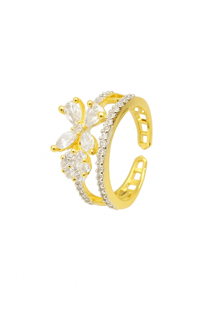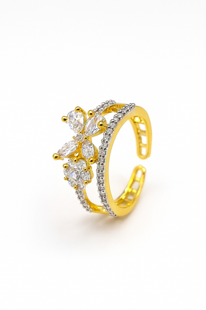 DETAIL : Delicate yet dazzling, this Gold Floral Diamond Cluster Ring adds a touch of romance to any ensemble. The ring features a stunning floral-inspired design, with sparkling diamond-cut stones arranged in a beautiful flower cluster on a gleaming gold band. The intricate band is also lined with shimmering stones, enhancing its luxurious appeal.