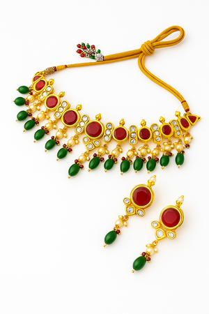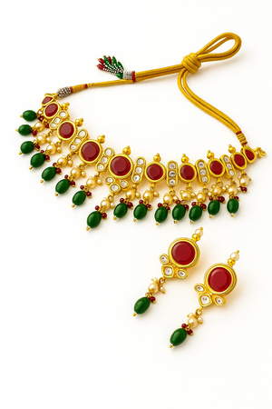 Regal Red Kundan Choker Necklace Set with Green Bead Drops