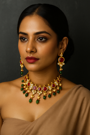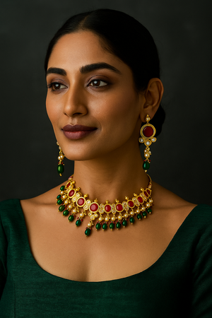 This captivating Kundan choker necklace set is a masterpiece of traditional Indian jewelry design. Featuring bold red glass stones encased in intricate gold-plated settings, the piece is adorned with delicate kundan work and accented with pearls and shimmering crystals. The bottom fringe is enriched with elegant green and red bead droplets, adding contrast and richness. The matching earrings mirror the choker’s grandeur, creating a cohesive and royal look. Crafted for elegance and comfort, this set is ideal for making a statement with minimal effort.