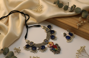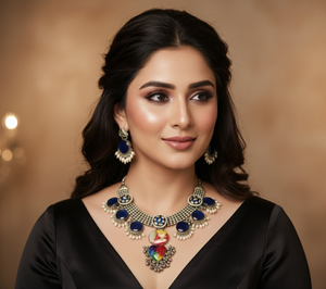 Make a bold statement with this stunning antique gold-toned necklace set, featuring deep blue stones, pearl accents, and a vibrant multicolor pendant that adds a pop of artistic flair. Paired with elegant matching earrings, this handcrafted design beautifully combines tradition with contemporary charm. A perfect accessory to bring elegance and vibrance to your look.