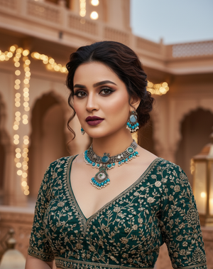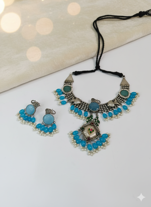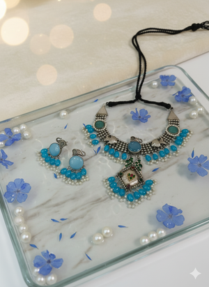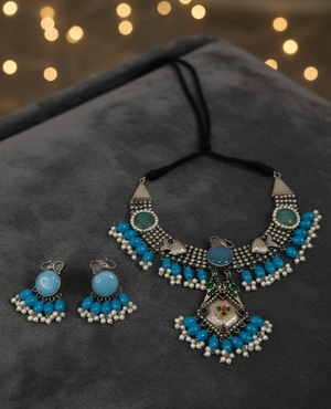 Elevate your look with this statement silver-toned necklace set, beautifully accented with turquoise blue beads, antique detailing, and pearl drops. Paired with matching earrings, this handcrafted piece adds a touch of elegance and tradition to your outfit. Perfectly balancing bold design with timeless charm, it’s the accessory you need to stand out.