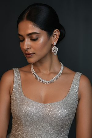DETAIL : The Celestia Carat Diamond Leaf Set is a stunning masterpiece featuring delicately arranged leaf motifs adorned with sparkling stones. This necklace and earrings set radiates elegance, making it perfect for both grand celebrations and intimate soirées