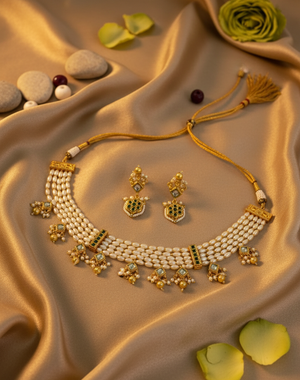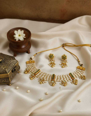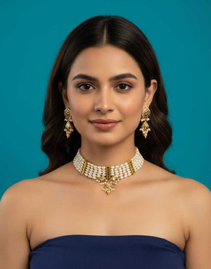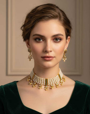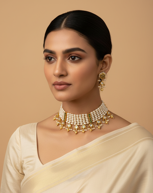 Elegant Pearl and Kundan Choker Necklace Set with Matching Drop Earrings
