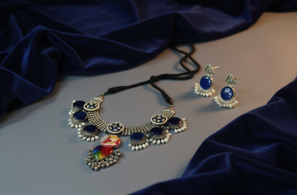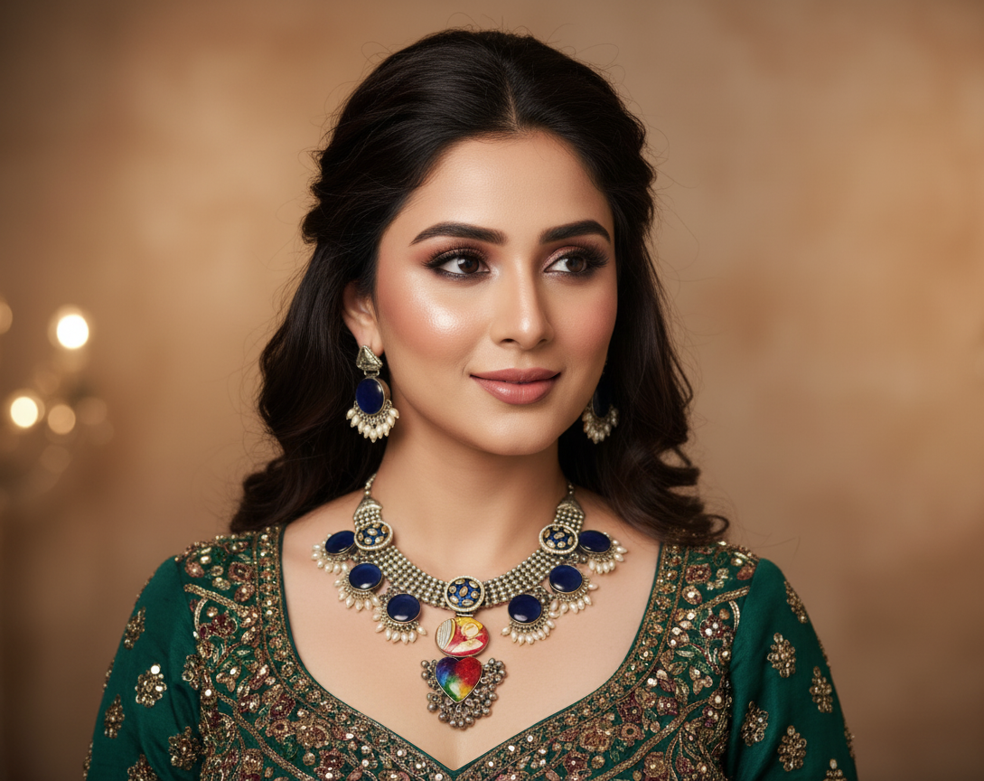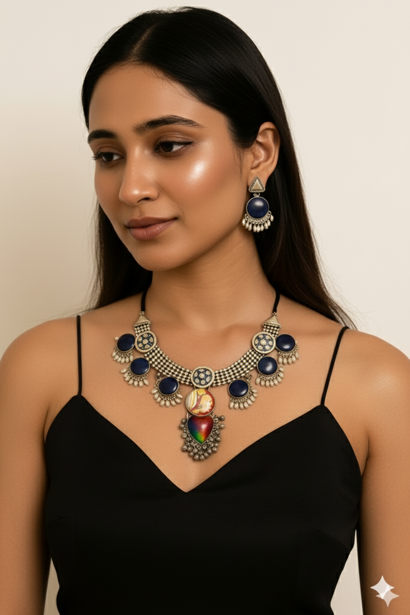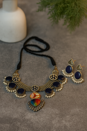 Make a bold statement with this stunning antique gold-toned necklace set, featuring deep blue stones, pearl accents, and a vibrant multicolor pendant that adds a pop of artistic flair. Paired with elegant matching earrings, this handcrafted design beautifully combines tradition with contemporary charm. A perfect accessory to bring elegance and vibrance to your look.
