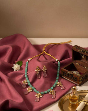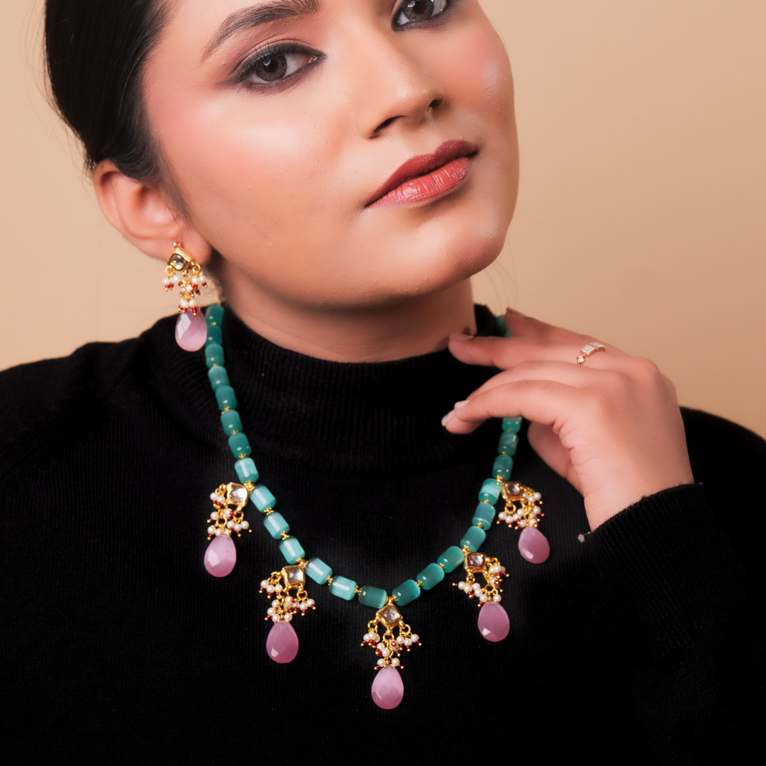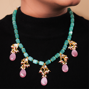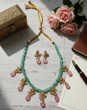 Add a touch of sophistication to your ensemble with this exquisite pastel jewelry set. The necklace features soft green beads paired with delicate pink tear-drop stones, enhanced by intricate gold-toned floral motifs. Paired with matching earrings, this piece perfectly balances traditional charm and modern elegance—making it an essential addition to your festive and occasion wear collection.