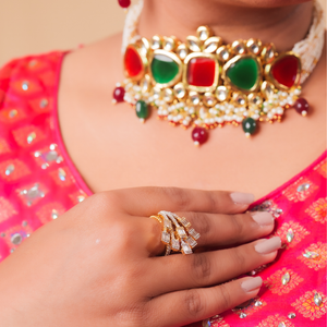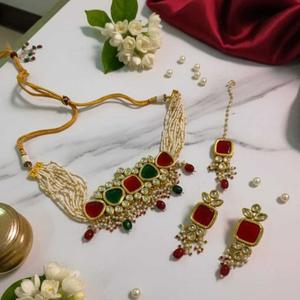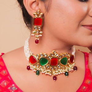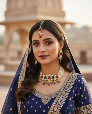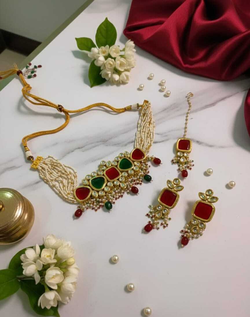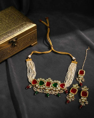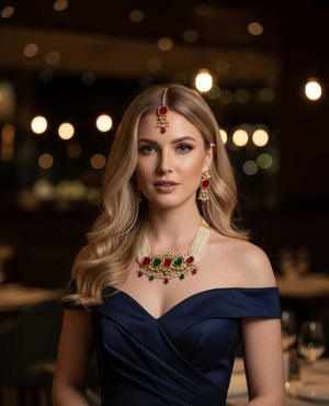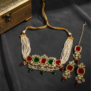 Dazzle in royal elegance with this Regal Kundan Choker Necklace Set, meticulously crafted to exude timeless grandeur. Featuring a harmonious blend of deep ruby red and rich emerald green stones, the necklace is adorned with delicate pearl detailing and gold-toned accents. The matching earrings and maang tikka enhance its majestic charm, making it a perfect statement piece for brides and festive occasions. This handcrafted masterpiece brings together traditional Indian artistry and modern sophistication, ensuring you shine at every celebration.