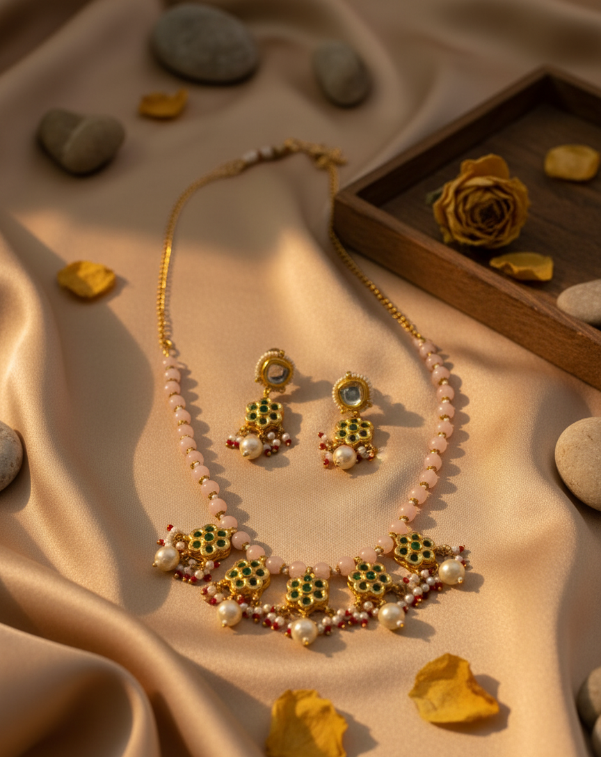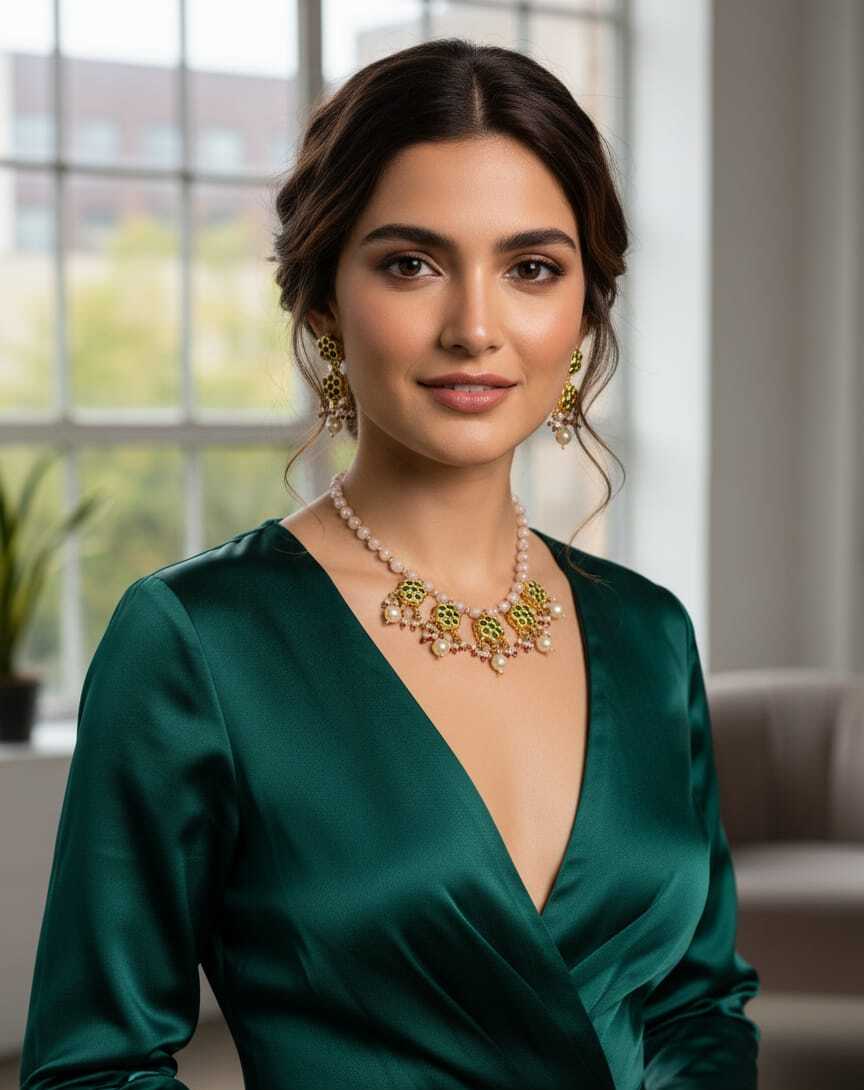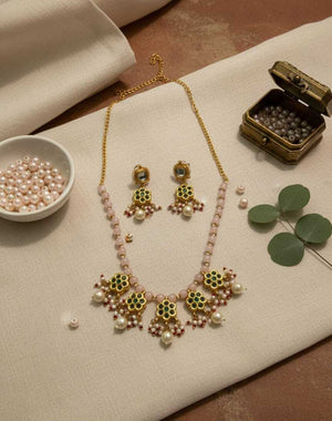 Step into timeless elegance with this stunning royal green and pearl necklace set. Beautifully handcrafted with intricate gold detailing and green enamel work, it exudes regal charm and sophistication. The necklace features delicate pearl beads and floral motifs, paired with matching earrings that complete the royal look. Perfect for adding a touch of grandeur to any traditional outfit.