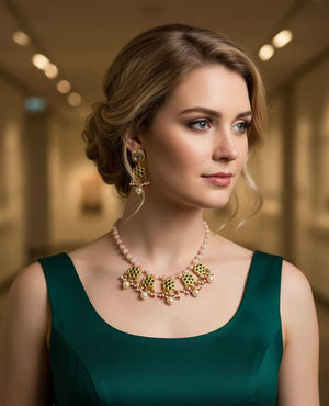 Royal Green & Pearl Gold-Tone Necklace Set with Matching Earrings