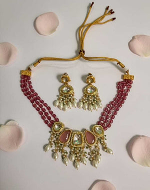 Royal Ruby Beaded Kundan Necklace Set with Pearl Drops