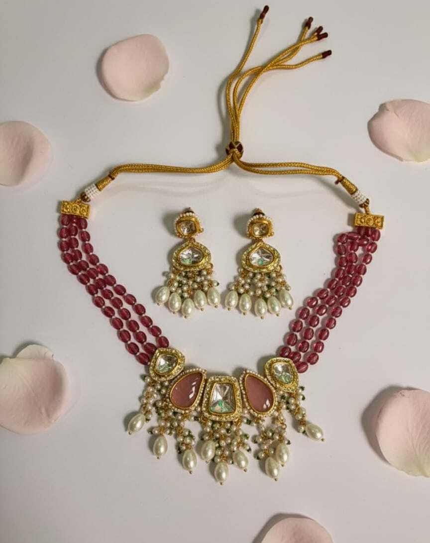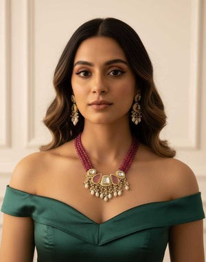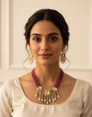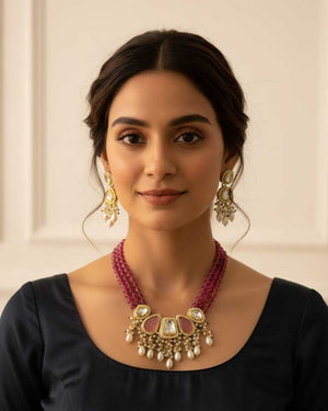 Elevate your traditional charm with this exquisite Royal Ruby Beaded Kundan Necklace Set, beautifully handcrafted to add a regal touch to your festive and bridal looks. The necklace features multiple strands of rich ruby-red beads adorned with intricate Kundan work and elegant pearl drops that exude luxury and grace. Paired with matching earrings, this statement set is designed to perfectly complement sarees, lehengas, and ethnic gowns, making you the center of attention at every occasion.