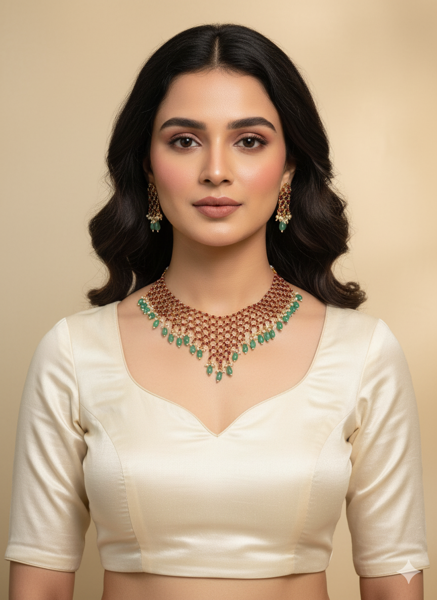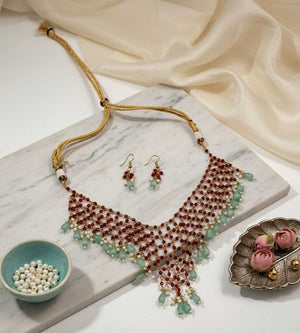Elevate your elegance with this stunning ruby red and green beaded necklace set. Designed with intricate craftsmanship, this choker-style necklace features layers of red crystal beads accented with green teardrop stones and gold highlights. The matching earrings add a graceful charm, making it a perfect accessory for any festive or traditional ensemble. This piece combines bold colors with refined design to create a truly timeless look.