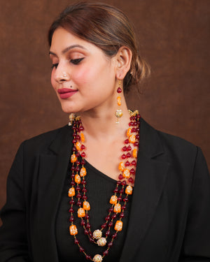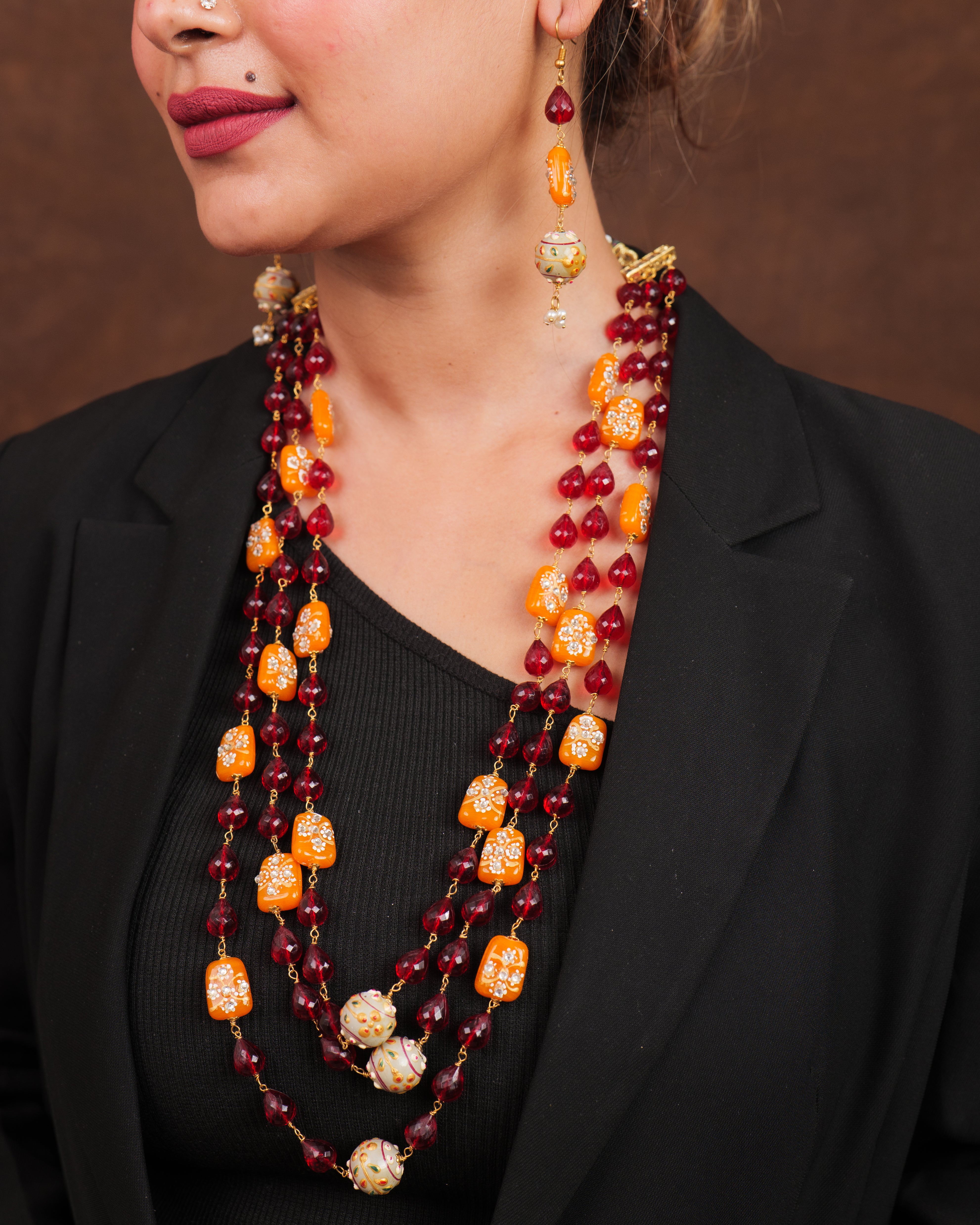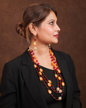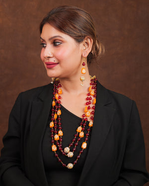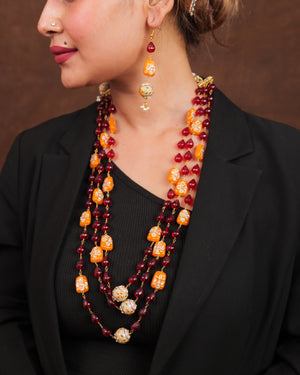 Make a bold fashion statement with this Vibrant Handcrafted Layered Beaded Necklace Set, a perfect blend of tradition and contemporary elegance. Featuring rich maroon-red and bright orange beads adorned with delicate golden detailing, this layered necklace adds a burst of color and charm to any outfit. Each bead is carefully handcrafted with precision, making every piece unique and full of character. The accompanying long drop earrings complete the set, adding a touch of artistic grace that effortlessly enhances your look.