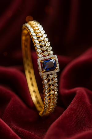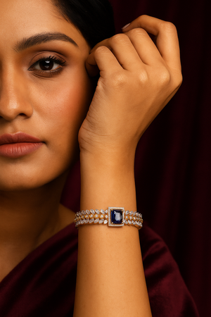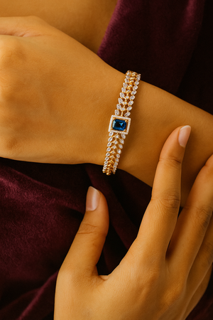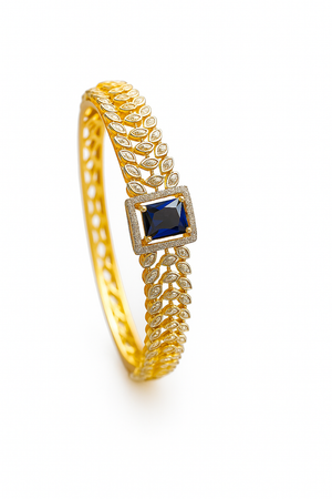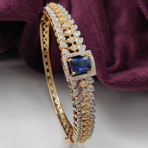 DETAIL : The Celestia Carat Royal Sapphire Bangle features a stunning square sapphire-colored stone surrounded by delicate leaf-like cubic zirconia accents, making it a regal addition to any jewelry collection.