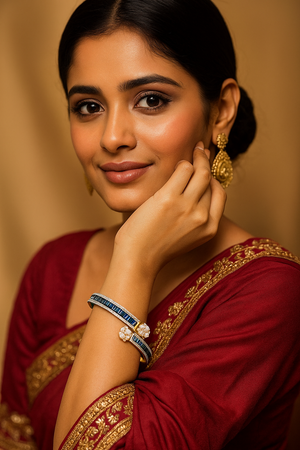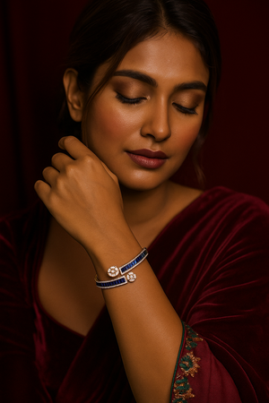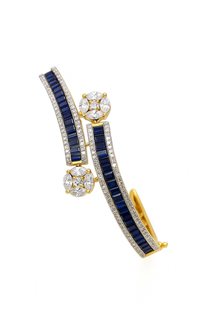 DETAIL : The Celestia Carat Sapphire Symphony Bangle combines elegant lines of sapphire baguettes with sparkling zirconia clusters, offering a symphony of luxury and style.