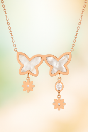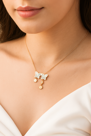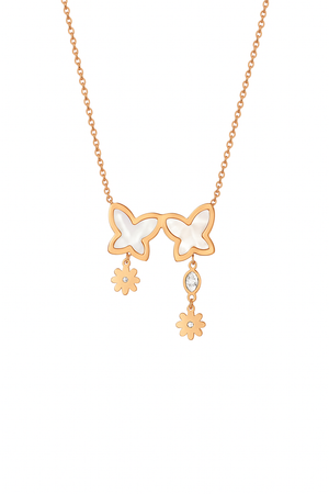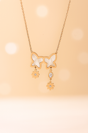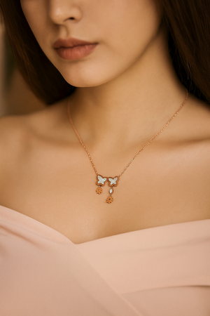 DETAIL : The Celestia Carat Butterfly Bloom Pendant features a delicate butterfly and floral design in soft gold tones. Accented with a sparkling crystal drop, this necklace adds a touch of elegance and whimsy to any outfit, perfect for day or night.