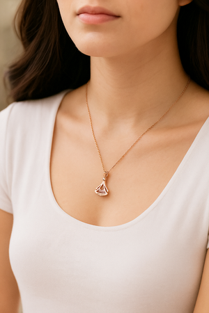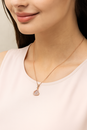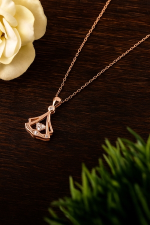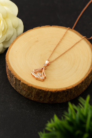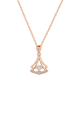DETAIL : The Celestia Carat Elegant Fan Pendant Necklace showcases a graceful fan-shaped pendant, adorned with sparkling crystals, suspended from a delicate rose gold chain. Its unique design exudes charm and sophistication, making it the perfect accessory for both casual and formal attire.