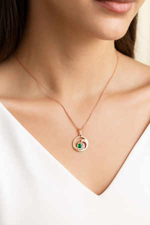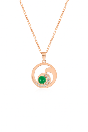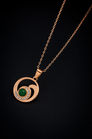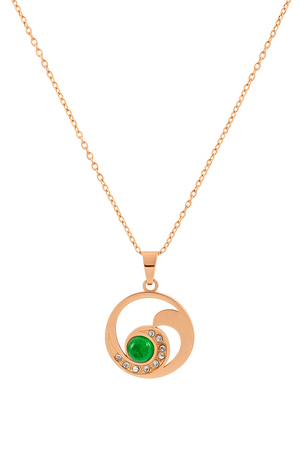 DETAIL : The Celestia Carat Emerald Swirl Pendant features an elegant swirl design with a striking emerald center stone. Encased in a polished gold-toned finish, this pendant is both modern and timeless, ideal for elevating any outfit with a touch of sophistication.