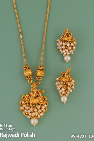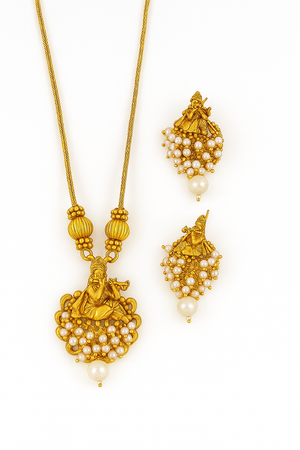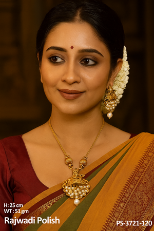 DETAIL : Exuding regal elegance, this Rajwadi Temple Necklace set in polished gold showcases traditional craftsmanship with a divine motif and pearl embellishments. Paired with matching earrings, this set brings a touch of heritage to any occasion.