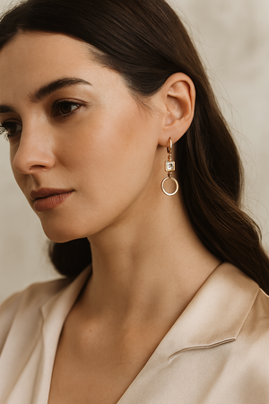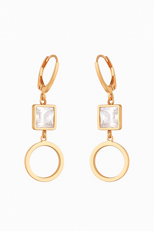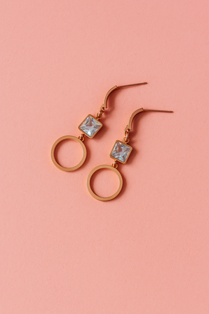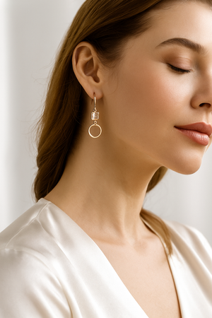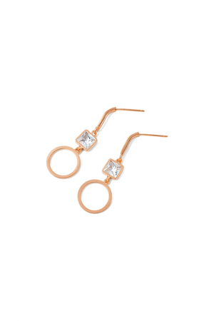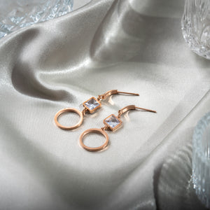 DETAIL : The Celestia Carat Geometric Grace Earrings feature a stunning combination of sleek circular and square elements in a sophisticated rose gold finish. With a touch of sparkle, these earrings are perfect for adding modern elegance to any look, from casual chic to evening glam.