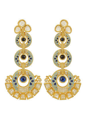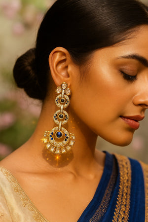 DETAIL : Add a touch of traditional elegance to your wardrobe with these stunning Gold and Blue Kundan Chandbali Earrings. Inspired by classic Indian jewelry designs, these earrings feature a delicate arrangement of circular motifs and are embellished with radiant Kundan stones. The blue accents, combined with the warm gold tones, make these earrings an exquisite addition to any festive or formal attire.