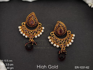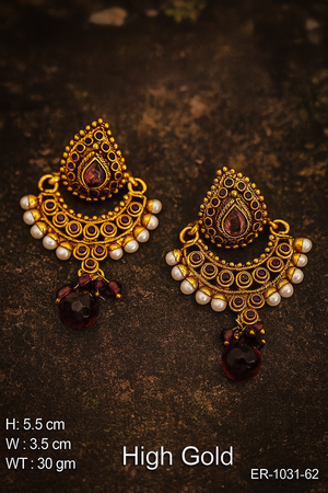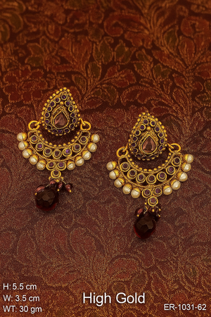 DETAIL : Adorn your look with these luxurious High Gold Antique Chandbali Earrings. With a rich, regal design inspired by traditional Indian craftsmanship, these earrings showcase a stunning blend of intricate detailing. Each piece is encrusted with elegant, simulated gemstones and pearls to create a timeless appearance that draws attention to its striking antique gold finish.