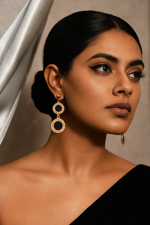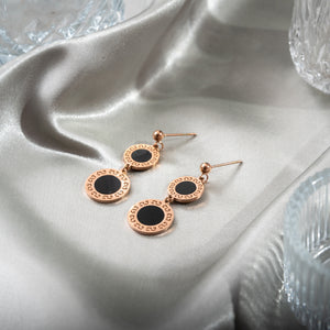DETAIL : The Celestia Carat Onyx Medallion Earrings feature bold black onyx discs encased in an elegant rose gold medallion design. With their sophisticated look and subtle geometric patterns, these earrings are perfect for adding a refined and modern touch to your attire.