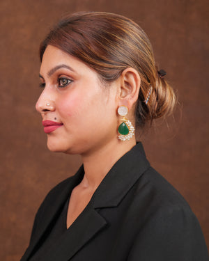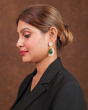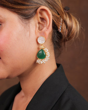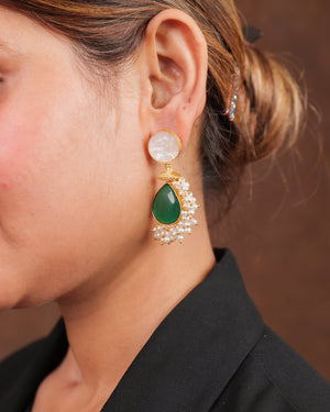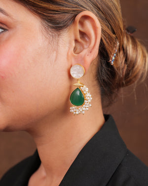 Make a bold yet elegant statement with these striking earrings featuring a rich green teardrop stone surrounded by a halo of dainty white pearls. Set in a golden base, the design is topped with a luminous round mother-of-pearl stud, adding a modern twist to traditional aesthetics. These earrings radiate class and charm, making them a versatile must-have in your accessory collection.