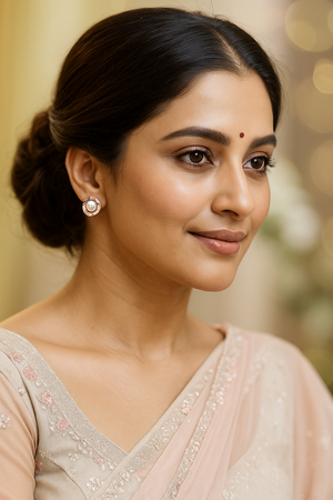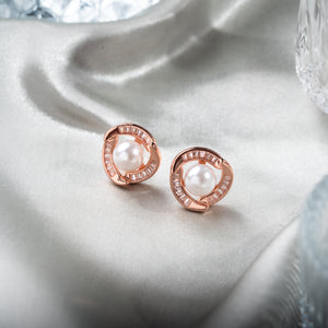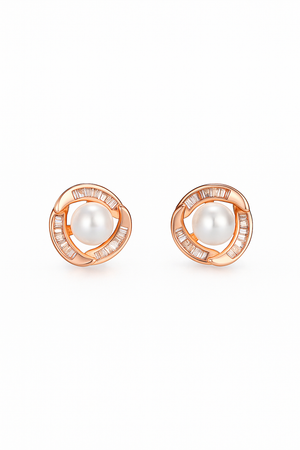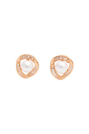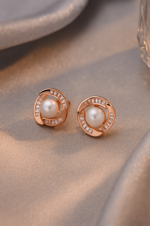 DETAIL : The Celestia Carat Rose Halo Earrings feature a lustrous pearl encased in a sleek rose gold halo, lined with sparkling stones. These dainty yet striking earrings are perfect for adding a touch of elegance to both casual and formal outfits.