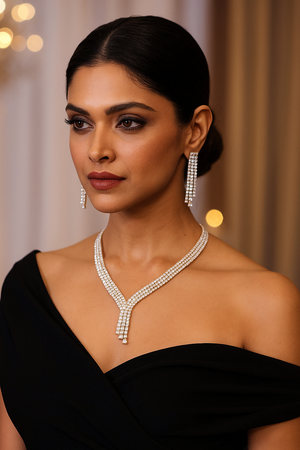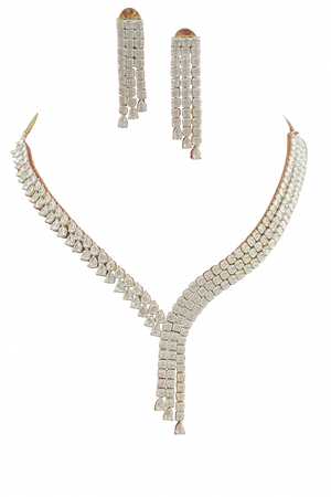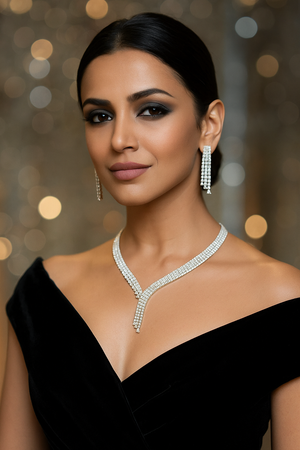 DETAIL : This stunning necklace and earrings set showcases a waterfall-like design, featuring rows of gleaming stones that flow gracefully. The unique V-shape of the necklace enhances its sophisticated allure, making it ideal for formal events or elegant gatherings