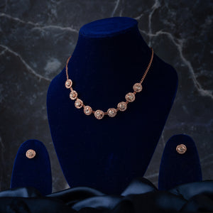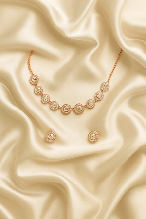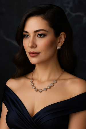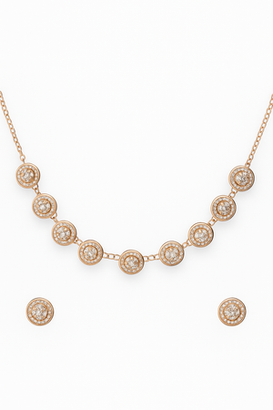 DETAIL : The Celestia Carat Crystal Circle Necklace Set exudes elegance with its series of circular crystal-embedded motifs. Each piece shines with precision-cut stones, offering a luxurious and refined appearance. The set includes matching earrings, making it perfect for special occasions.