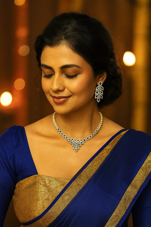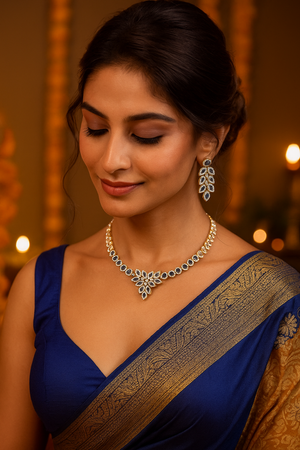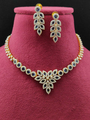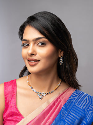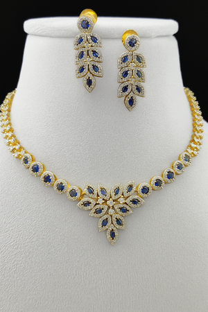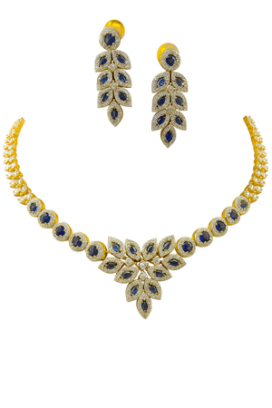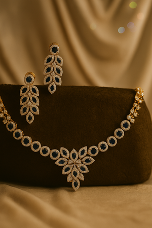 DETAIL : This exquisite necklace and earrings set features a striking floral centerpiece adorned with sapphire-like stones, surrounded by intricate detailing. The rich combination of blue and clear stones adds a touch of royalty and grace, perfect for any grand occasion.