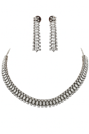 DETAIL : This dazzling necklace and earrings set features rows of delicate teardrop-shaped stones that catch the light beautifully. The set exudes grace and sophistication, making it the perfect accessory for formal events or a glamorous night out.