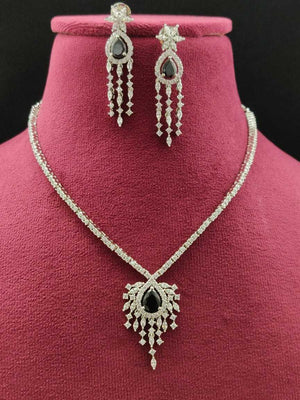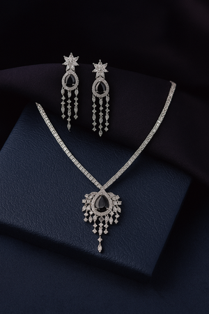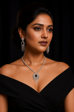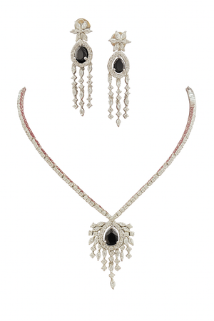 DETAIL : A breathtaking necklace and earrings set with a stunning black teardrop centerpiece surrounded by sparkling stones. The earrings feature cascading strands that add elegance to any attire, perfect for evening events.
