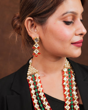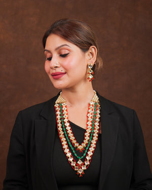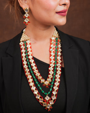 DETAIL : The Celestia Carat Regal Emerald Necklace Set exudes traditional elegance with its intricate craftsmanship. Featuring vibrant green beads and a beautifully detailed kundan pattern, this multi-layered necklace is paired with matching earrings, perfect for grand occasions and ethnic celebrations.