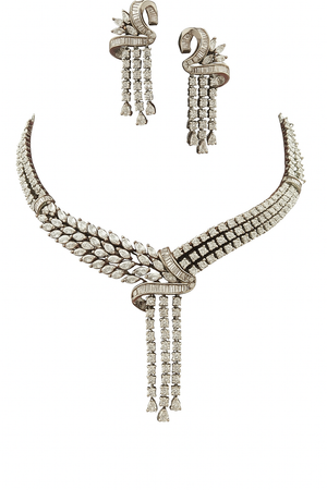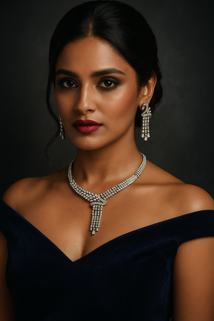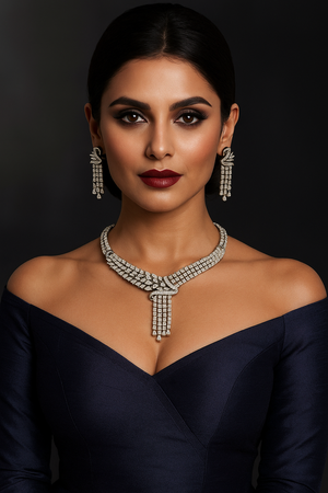DETAIL : The Celestia Carat Regal Flow Set embodies opulence with its cascading stone design that flows gracefully across both the necklace and earrings. The intricate detailing adds a majestic flair, making it the perfect choice for formal events and grand occasions.