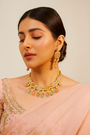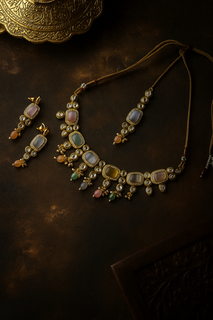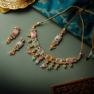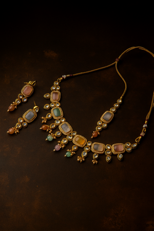 DETAIL : A majestic blend of pastel-colored stones and intricate gold detailing, this necklace exudes royalty. The matching earrings mirror the necklace's pastel gems and golden frames, offering a complete, elegant look for any formal occasion.