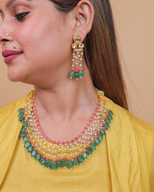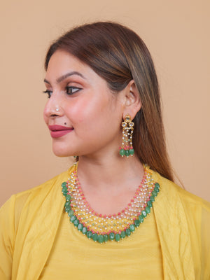 Deep green beads meet delicate pink accents, beautifully separated by classic white dividers — a perfect harmony of bold elegance and subtle charm. Wear the Royal Bloom Necklace Set to add timeless grace to your festive or ethnic ensemble.