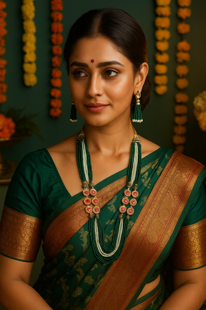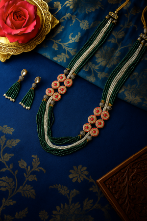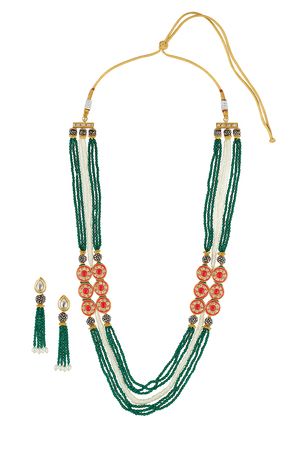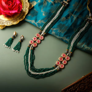 DETAIL : The Celestia Carat Royal Emerald Moti Necklace Set is a majestic blend of emerald-green and pearl-white beads, accentuated with vibrant floral motifs. Paired with matching tassel earrings, this statement set is designed to enhance your regal look during weddings and festive occasions.