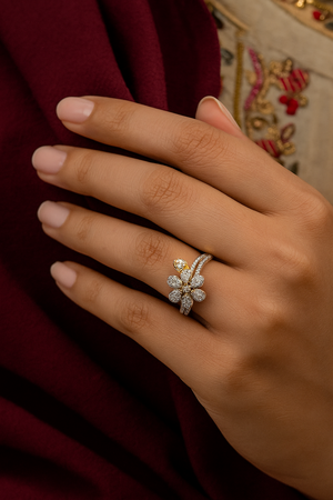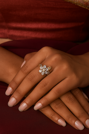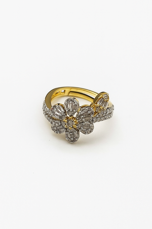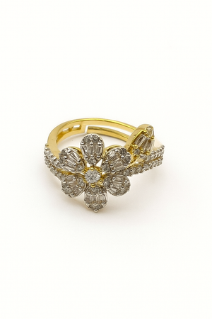 DETAIL : This dazzling floral ring features intricately designed petals encrusted with shimmering crystals, set on a golden band. Perfect for adding a touch of elegance to any ensemble, this ring beautifully captures nature's charm with a modern twist.