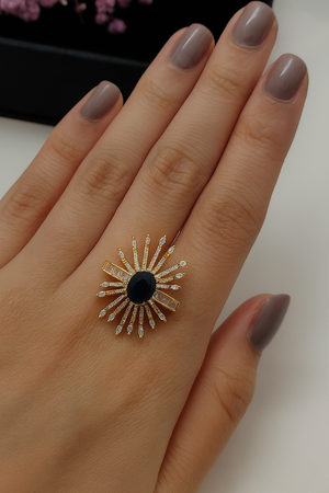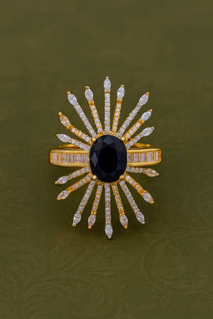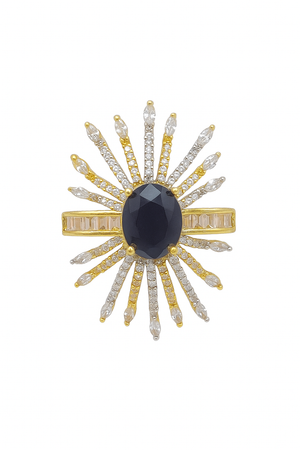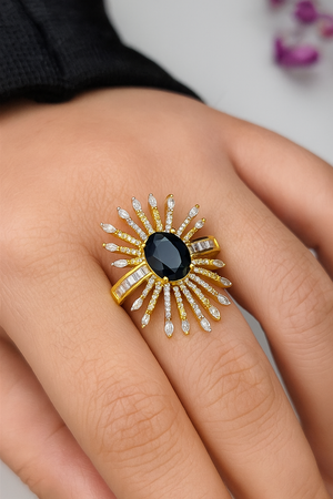 DETAIL : The Celestia Carat Midnight Sunburst Ring is a captivating and dramatic piece of jewelry that brings a modern twist to classic elegance. At the center of this bold design lies a mesmerizing oval black stone, exuding mystery and sophistication. Radiating outward from the center are alternating gold-tone bars and sparkling cubic zirconia stones, mimicking the rays of a brilliant sunburst.
