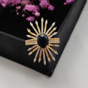 Occasion : The Celestia Carat Midnight Sunburst Ring is a captivating and dramatic piece of jewelry that brings a modern twist to classic elegance. At the center of this bold design lies a mesmerizing oval black stone, exuding mystery and sophistication. Radiating outward from the center are alternating gold-tone bars and sparkling cubic zirconia stones, mimicking the rays of a brilliant sunburst.